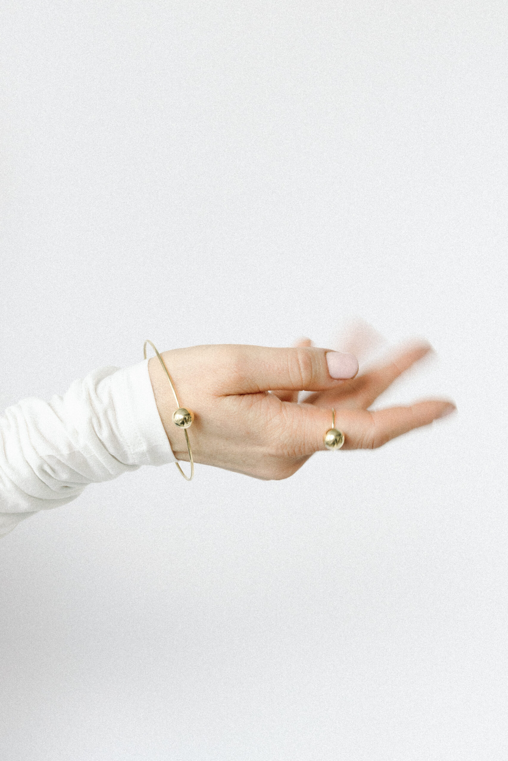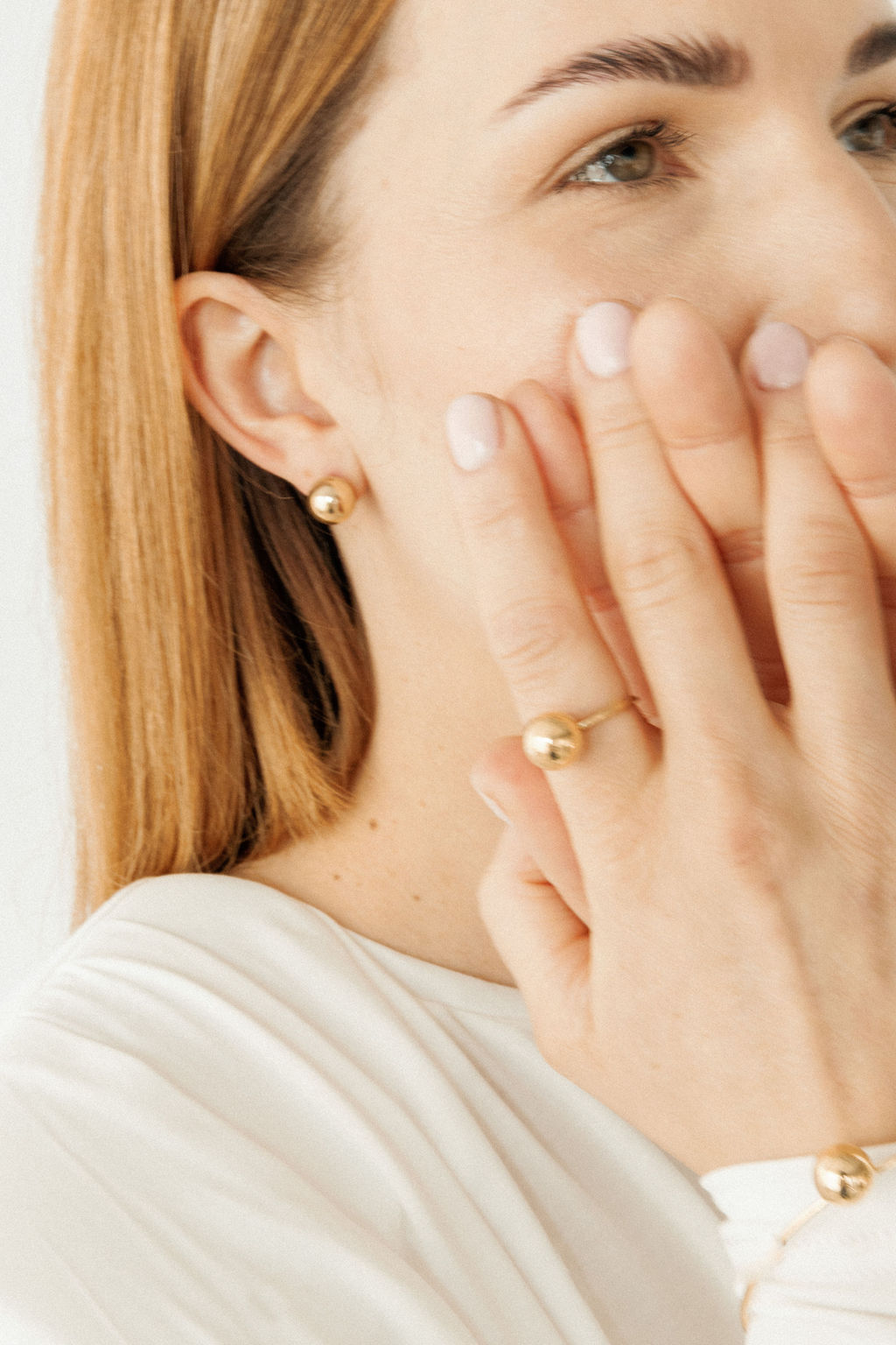 Dostępny w dwóch wariantach: kula większa 10mm, kula mniejsza 9mm. Na zdjęciu modelka posiada opcję pierścionka z kulą 10mm.