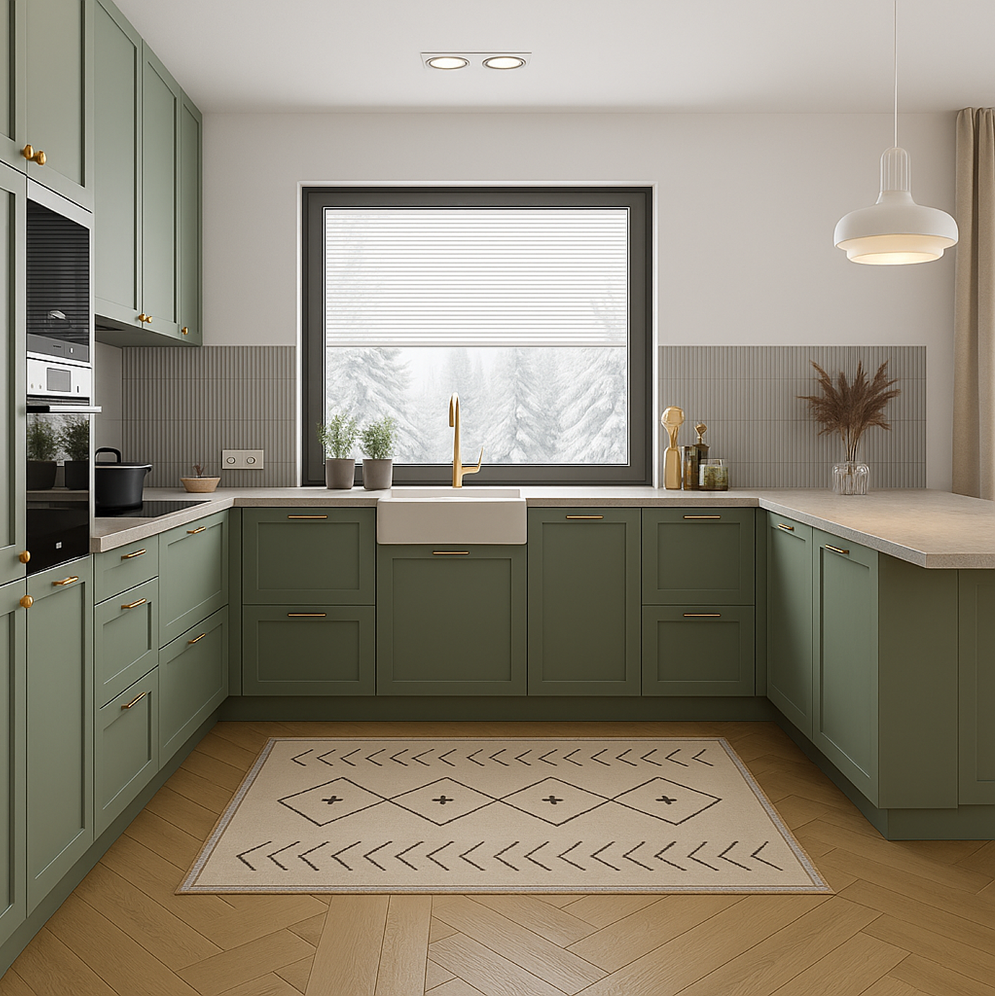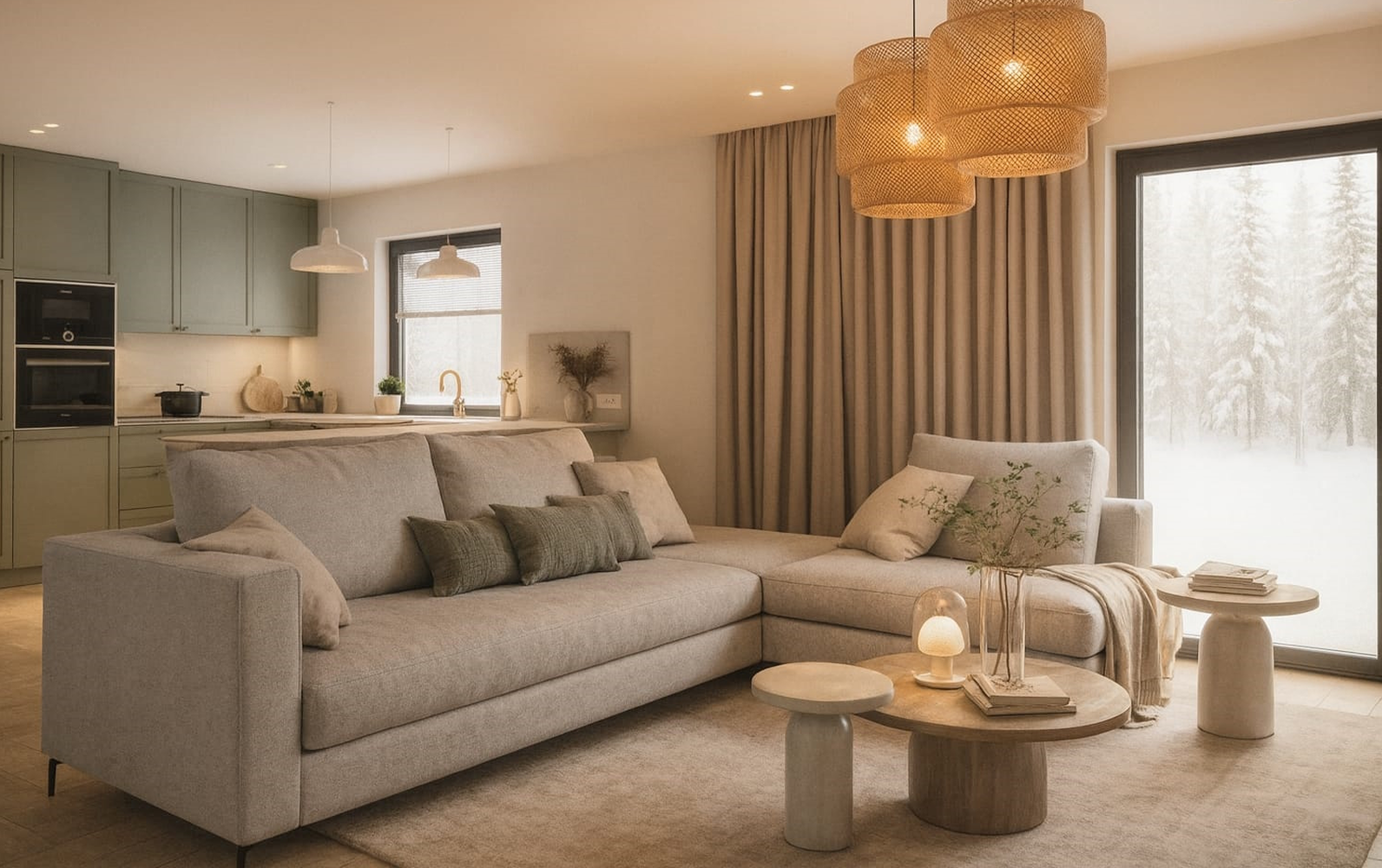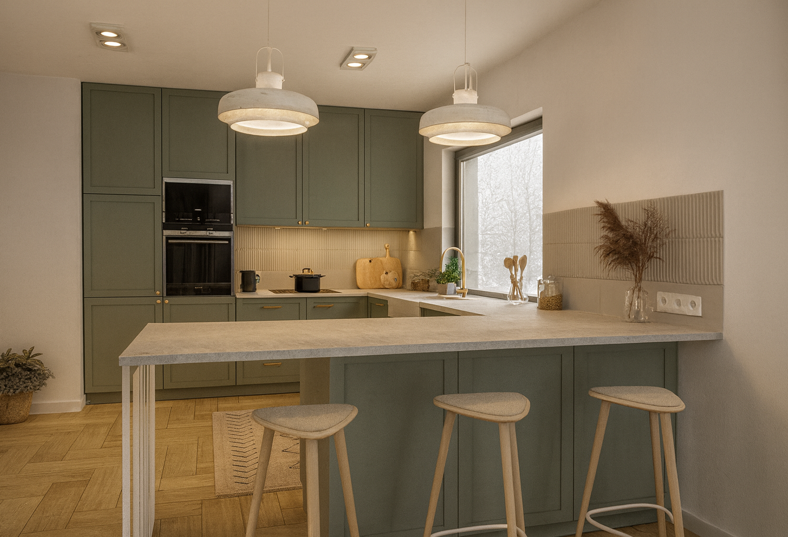 Kuchnia w odcieniach zieleni, uzupełniona kamiennym blatem, tworzy spójną i ponadczasową kompozycję dopasowaną do oczekiwań Inwestora. Salon zaprojektowano w sposób minimalistyczny — proste formy i ograniczona liczba elementów pozwalają zachować poczucie przestrzeni oraz wizualny porządek.